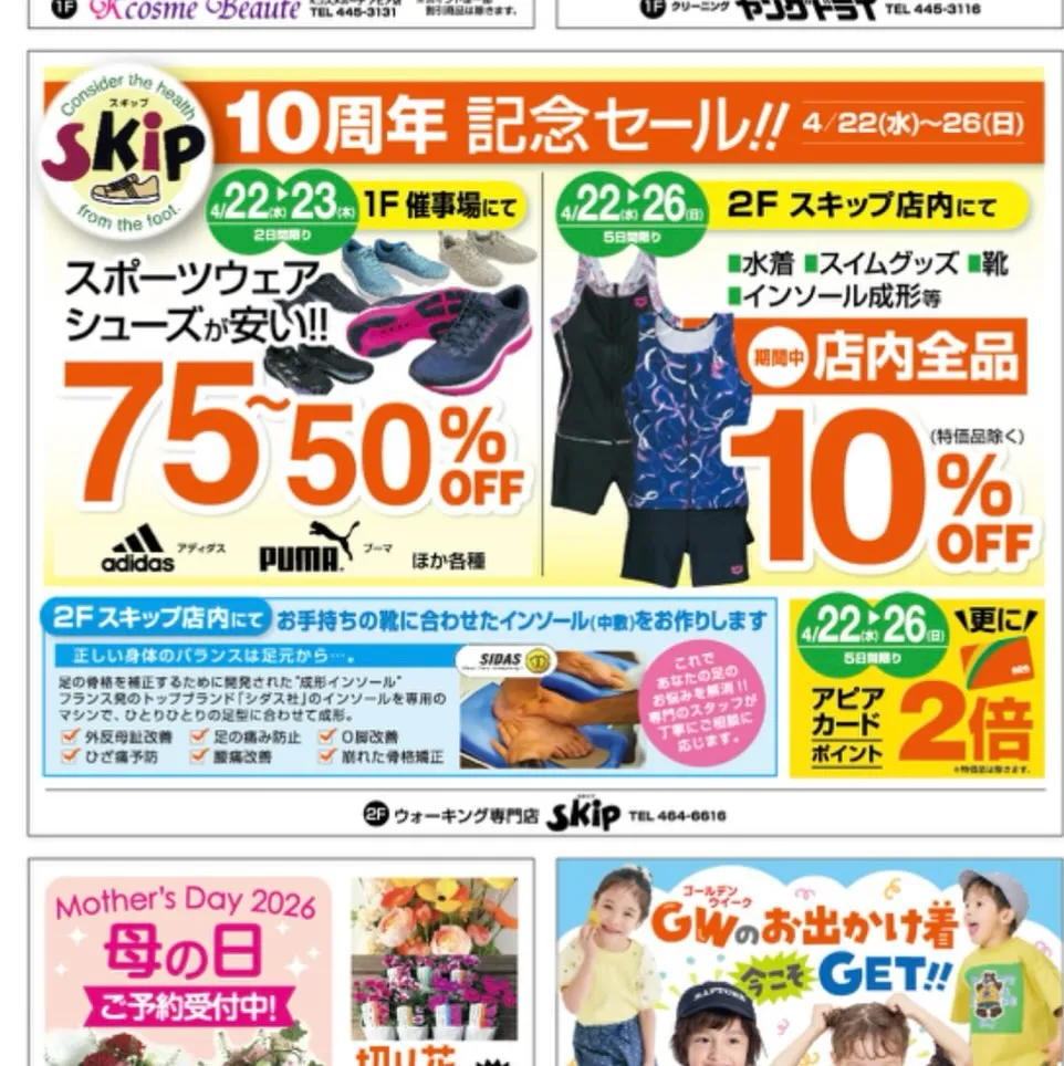 明日4/22(水)、23(水)1階中央広場にてシューズとスポーツウェアのセールをします。